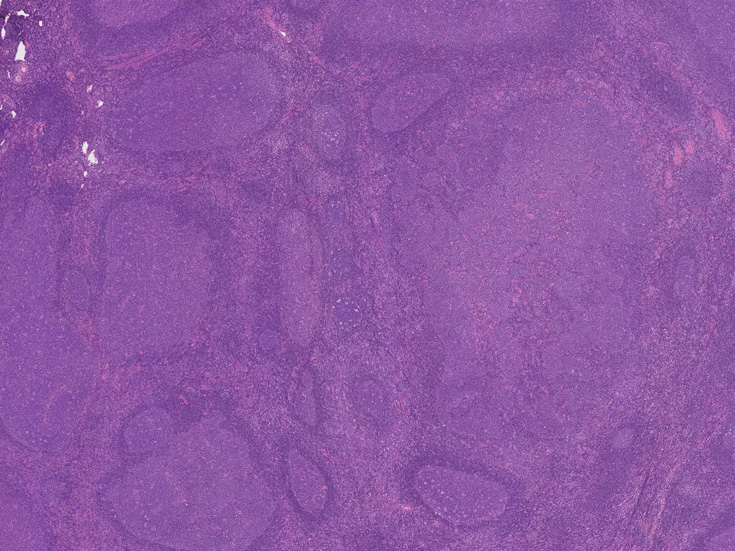 大きな胚中心を持つ多数のリンパ濾胞が見られる。胚中心の辺縁は不明瞭でマントル層も薄くなっている。1カ所マントル層リンパ球の侵入によりバラバラになった巨大な胚中心が認められ, macrofollicular patternと記載されるPTGCです。