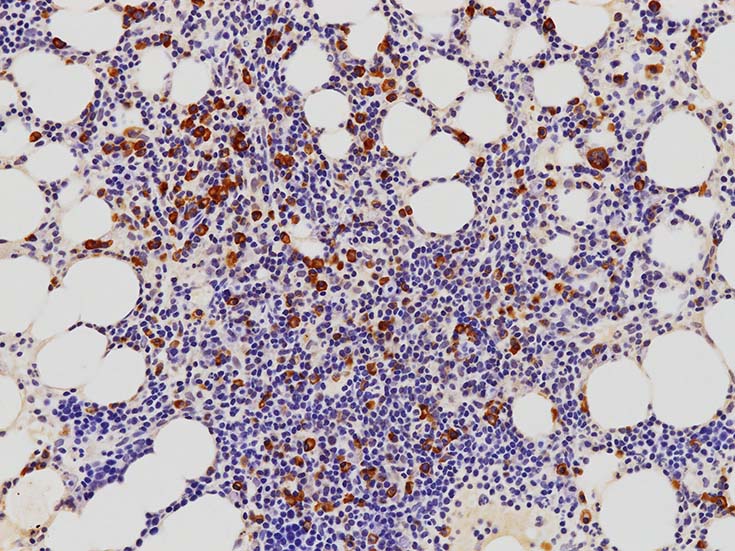 通常/ 正常の骨髄クロットでは 背景タンパク液のIgMはそまらないかごく淡い陽性. しっかり陽性を示す本例では血中IgMの増加を示唆する. IgMに染まる形質細胞が増加している.