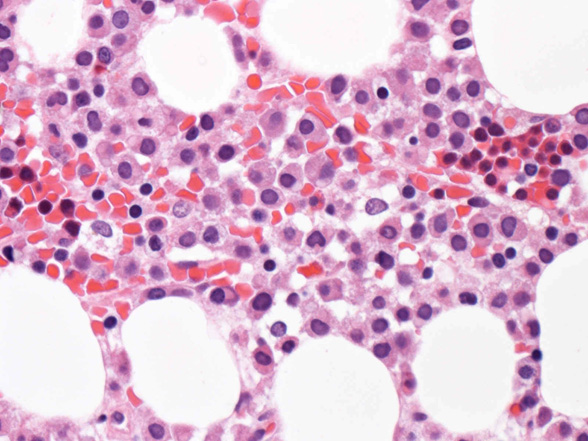 骨髄clot sectionは小型のparticleが一個のみ認められた。正常造血は抑制され異型核の幼若細胞が増殖。MPOびまん性陽性。末梢血では異型前骨髄球様細胞が出現。