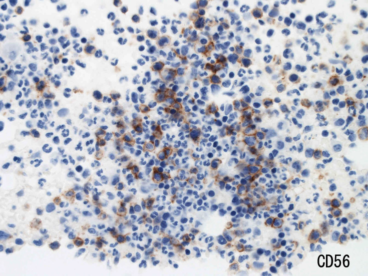MG染色での大型異型細胞はCD56, CD30陽性。CD3は陰性を示す