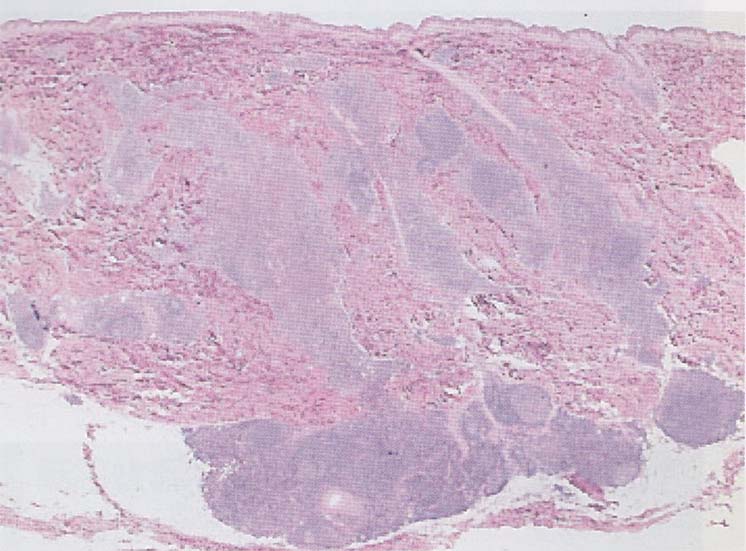 3. リンパ球を主体とする. Lymphocytes predominate. 混合性細胞浸潤巣が一般的.