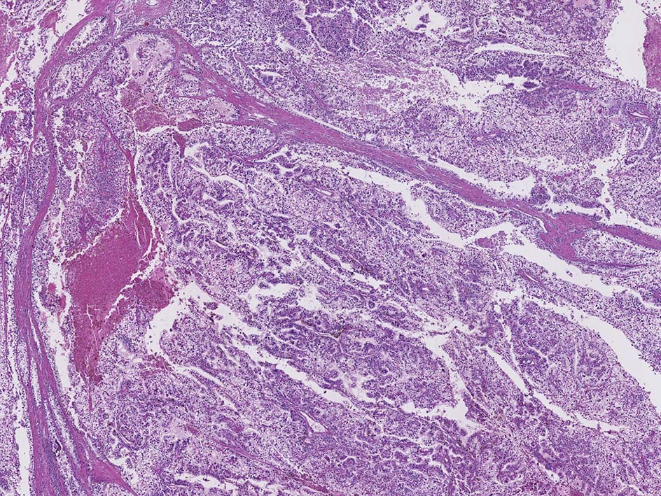 microscopicには, 多くは不完全な血管隔壁で分葉化された, シート状充実性腫瘍. 小型胞巣状, 管状, 微小嚢胞状, 索状構築をとることもある.
