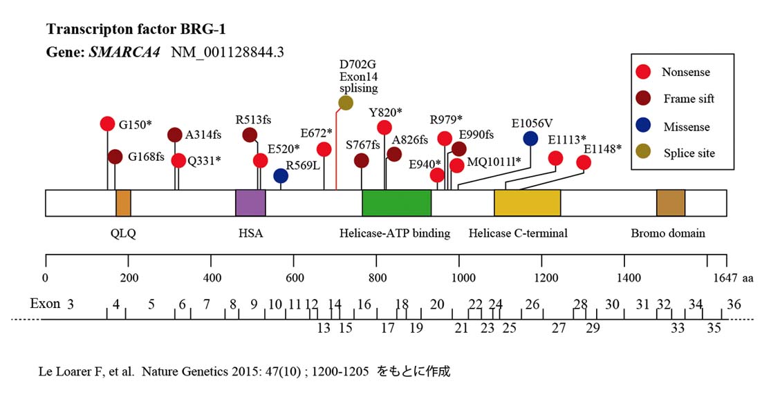 最終的にSMARCA4変異を示す19例を解析しnonsense mutation(n = 10), frame shift (n=6), missense (n=2)を検出, およびsplice site(n=1)が認められた. (右図)*1