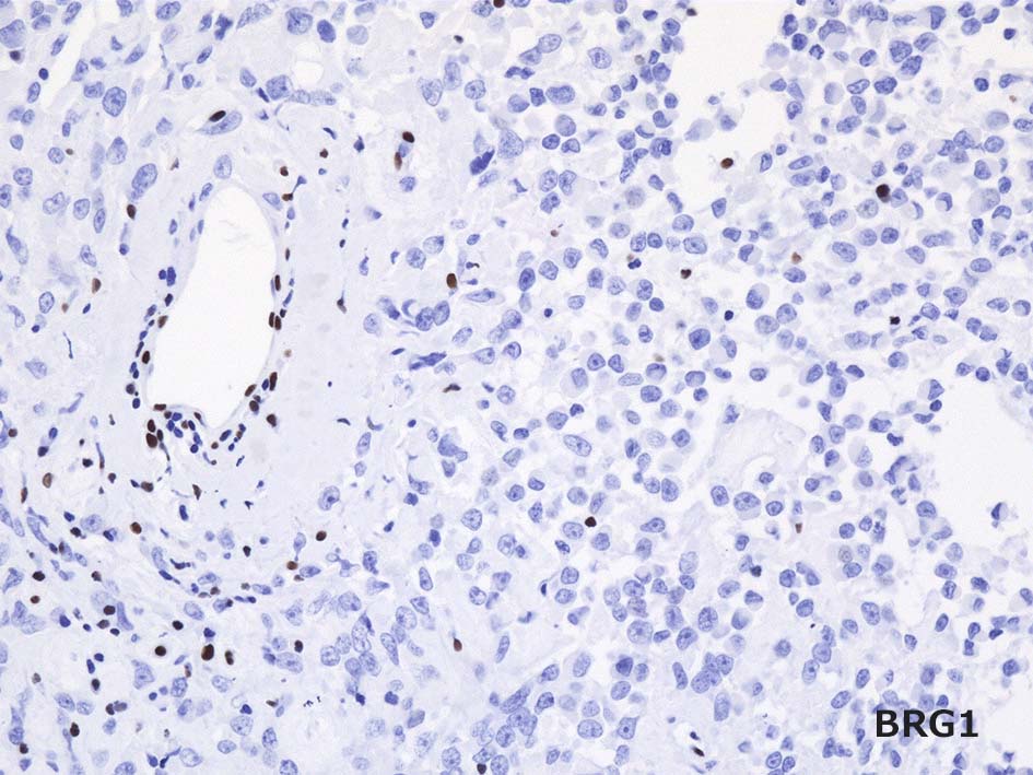 BRG1は核染色性が消失. internal controlの血管内皮や炎症細胞は核に陽性となる. INI1(SNF5/SMARCAB1)はびまん性に陽性. p53が多くの腫瘍細胞に陽性となる.