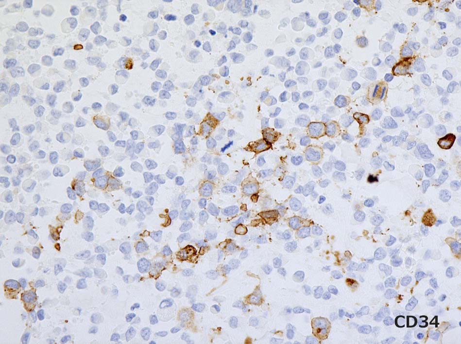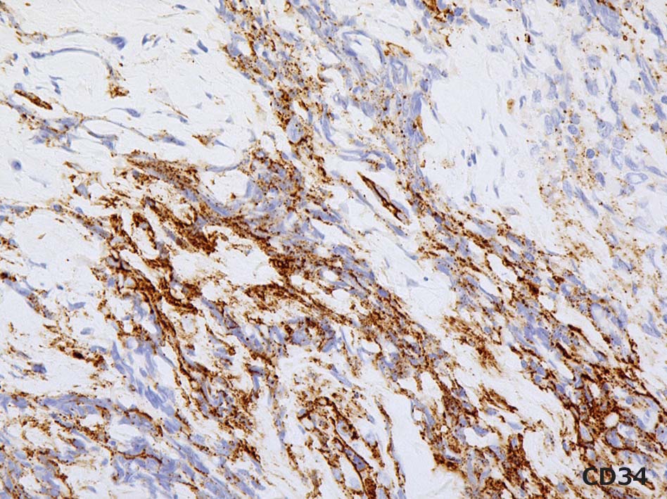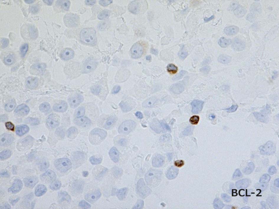 Vimentin, CD99(MIC2)はびまん性に陽性を示す. CD34はfocalに陽性. 異型 spindle cellにも陽性を呈する. EMAは少数の陽性細胞あり. BCL2はリンパ球に陽性. 腫瘍細胞はほぼ陰性. 淡く染まる細胞がごく少数ある. CK(AE1/3)は陰性. p53はびまん性, 80%に陽性. (photo準備中). MIB-1 LIは>90%.