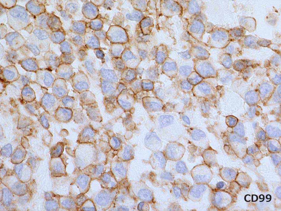 軽鎖がわずかに陽性となり, 最初 plasmacytomaとDxされたが他のmyeloma marker陰性, light chain PCRはnon-clonalパターンであった.追加の免染で, vimentin, CD99(MIC2)陽性、CD34, BCL2がごく一部に陽性など分化不明の肉腫.