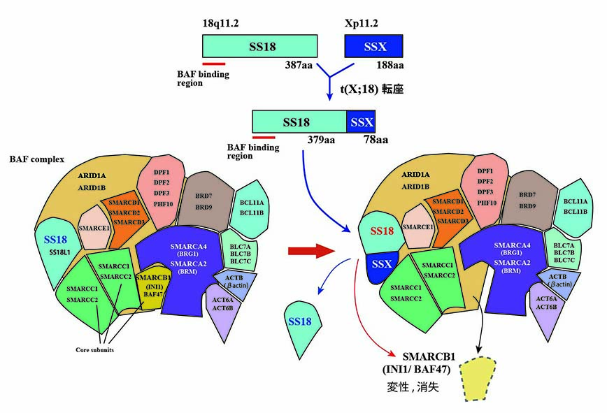 *1 Kadoch C, Crabtree GR. Reversible disruption of mSWI/SNF (BAF) complexes by the SS18-SSX oncogenic fusion in synovial sarcoma. Cell. 2013 Mar 28;153(1):71-85. doi: 10.1016/j.cell.2013.02.036. PMID: 23540691 *2 Ladanyi M., Antonescu C.R., Leung D.H., et. al. Cancer Res 2002; 62: pp. 135-140. *3 Duband S., Morrison A.L., Pasquier D., et. al.: .Am J Perinatol 2008; 25: pp. 517-520. *4 Duband S., Morrison A.L., Pasquier D., et. al. Am J Perinatol 2008; 25: pp. 517-520. *5 Egger J.F., Coindre J.M., Benhattar J., et. al. Radiation-associated synovial sarcoma: clinicopathologic and molecular analysis of two cases.Mod Pathol 2002; 15: pp. 998-1004. *6 Bui-Mansfield L.T., O’Brien S.D. Magnetic resonance appearance of intra-articular synovial sarcoma: case reports and review of the literature.J Comput Assist Tomogr 2008; 32: pp. 640-644. *7 Michal M., et. al. Minute synovial sarcomas of the hands and feet: a clinicopathologic study of 21 tumors less than 1 cm.Am J Surg Pathol 2006; 30: pp. 721-726. *8 Kusuma S., Skarupa D.J., Ely K.A., et. al.: Synovial sarcoma of the head and neck: a review of its diagnosis and management and a report of a rare case of orbital involvement.Ear Nose Throat J 2010; 89: pp. 280-283. *9 Gopalakrishnan V., Amini B., Wagner M.J., et. al. Synovial sarcoma of the head and neck: a single institution review.Sarcoma 2017; 2017: pp. 2016752. *10 Owosho A.A., et. al. .Oral Oncol 2017; 66: pp. 46-51. *11 Fetsch J.F., Meis J.M.: Synovial sarcoma of the abdominal wall.Cancer 1993; 72: pp. 469-477. *12 Maeda S., Takano H., Yamauchi T., et. al.: Primary synovial sarcoma of the left heart with large amount of necrotic tissue.Gen Thorac Cardiovasc Surg 2018; 66: pp. 365-367. *13 Lan T., Chen H., Xiong B., et. al.: Primary pleuropulmonary and mediastinal synovial sarcoma: a clinicopathologic and molecular study of 26 genetically confirmed cases in the largest institution of Southwest China.Diagn Pathol 2016; 11: pp. 62. *14 Schoolmeester J.K., Cheville J.C., Folpe A.L.: Synovial sarcoma of the kidney: a clinicopathologic, immunohistochemical, and molecular genetic study of 16 cases.Am J Surg Pathol 2014; 38: pp. 60-65. *15 Olofson A.M., Linos K.: Primary intraprostatic synovial sarcoma.Arch Pathol Lab Med 2017; 141: pp. 301-304. *16 Romeo S., Rossi S., Acosta Marin M., et. al.: Primary synovial sarcoma (SS) of the digestive system: a molecular and clinicopathological study of fifteen cases.Clin Sarcoma Res 2015; 5: pp. 7. *17 Chrisinger J.S.A., Salem U.I., Kindblom L.G., et. al.: Synovial sarcoma of peripheral nerves: analysis of 15 cases.Am J Surg Pathol 2017; 41: pp. 1087-1096. *18 病理と臨床17;9:951-958,1999 *19 Enzinger and Weiss's Soft tissue tumors, 4th ed. p1503, 2001 *20 Enzinger and Weiss's Soft tissue tumors, 4th ed. p1503, 2001 *21 Folpe AL, et al., Poorly differentiated synovial sarcoma: immunohistochemical distinction from primitive neuroectodermal tumors and high-grade malignant peripheral nerve sheath tumors. Am J Surg Pathol. 1998 Jun;22(6):673-82. PMID: 9630174 *22 van de Rijn M, et al. Poorly differentiated synovial sarcoma: an analysis of clinical, pathologic, and molecular genetic features. Am J Surg Pathol. 1999 Jan;23(1):106-12. PMID: 9888710 *23 Miettinen M. Keratin subsets in spindle cell sarcomas. Keratins are widespread but synovial sarcoma contains a distinctive keratin polypeptide pattern and desmoplakins. Am J Pathol. 1991 Feb;138(2):505-13. PMID: 1704194 free download 可 *24 Hazelbag HM et al., Chain-specific keratin specific profile of epithelioid soft tissue sarcoma: an immunohistochemical study on synovial sarcoma and epithelioid sarcoma. Appl Immunohistochem 4: 176, 1996 Appl Immunohisochemは誌名が変わったのかpub medに出てこないです。 *25 Smith TA, Machen SK, Fisher C, Goldblum JR., Usefulness of cytokeratin subsets for distinguishing monophasic synovial sarcoma from malignant peripheral nerve sheath tumor. Am J Clin Pathol. 1999 Nov;112(5):641-8. *26 Genes Chromosome Cancer 23:198-201, 1998 *27 Clark J, et al.,Identification of novel genes, SYT and SSX, involved in the t(X;18)(p11.2;q11.2) translocation found in human synovial sarcoma. Nat Genet 1994 Aug;7(4):502-8.doi: 10.1038/ng0894-502. PMID: 7951320 *28 Skytting B, et al. A novel fusion gene, SYT-SSX4, in synovial sarcoma J Natl Cancer Inst 1999 Jun 2;91(11):974-5. doi: 10.1093/jnci/91.11.974. PMID: 10359553 DOI: 10.1093/jnci/91.11.974 *29 de Leeuw B, et al. Identification of two alternative fusion genes, SYT-SSX1 and SYT-SSX2, in t(X;18)(p11.2;q11.2)-positive synovial sarcomas. Hum Mol Genet 1995 Jun;4(6):1097-9.PMID: 7655467 doi: 10.1093/hmg/4.6.1097.