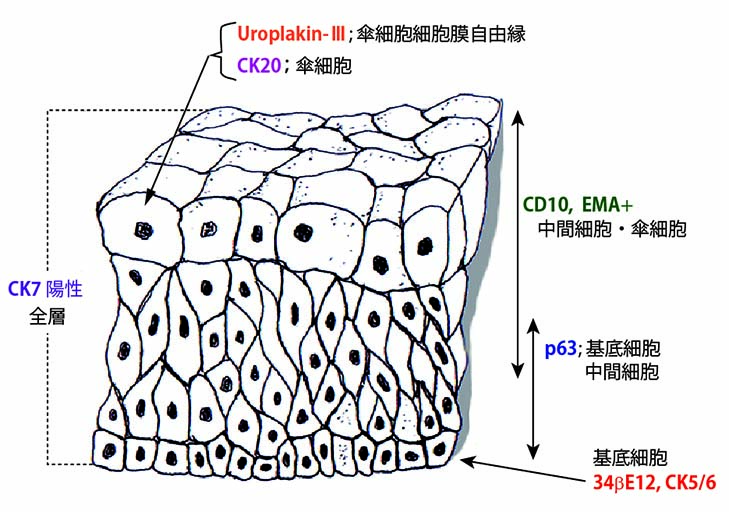 表層へ向かうにしたがい, N/C比が小さくなる傾向がある. 核にはコーヒー豆様の溝(核溝)をもつことが多い.被蓋細胞はN/C比は低く円形核をもつ.膀胱の部位や伸展により細胞層の厚みや形態が変化する. また核が時に大型化する. いずれも悪性所見としてはならない。