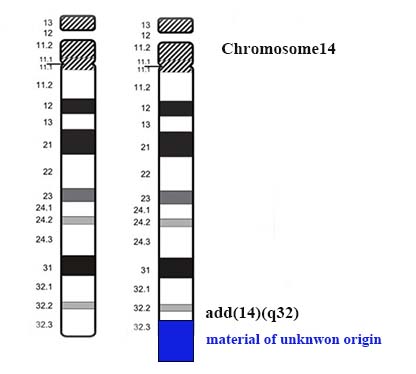 14番染色体長腕q32バンドで切断し、その断端に由来不明の染色体断片が付加(add)したことを意味します。均衡型相互転座が隣接分離して生じた不均衡型相互転座です。14q32からq末端に至るセグメントの欠失(部分モノソミー)と、由来不明の断片の付加(部分トリソミー)です。 次のように書くこともできます。der(14)t(14;?)(q32;?)