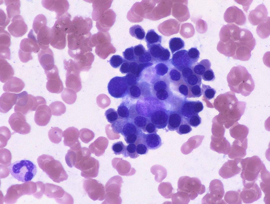 - 直径20μmほど.赤芽球系細胞では最大. 類円形の核を細胞中心にもつ.クロマチンは繊細顆粒状でアズキ色の点描のように見える.核には青みの強い核小体を2-3個もつ.