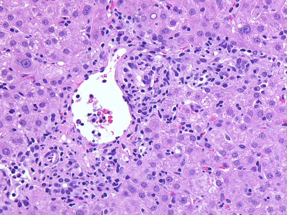 グリソン鞘, 小葉にリンパ球の浸潤がめだつ。