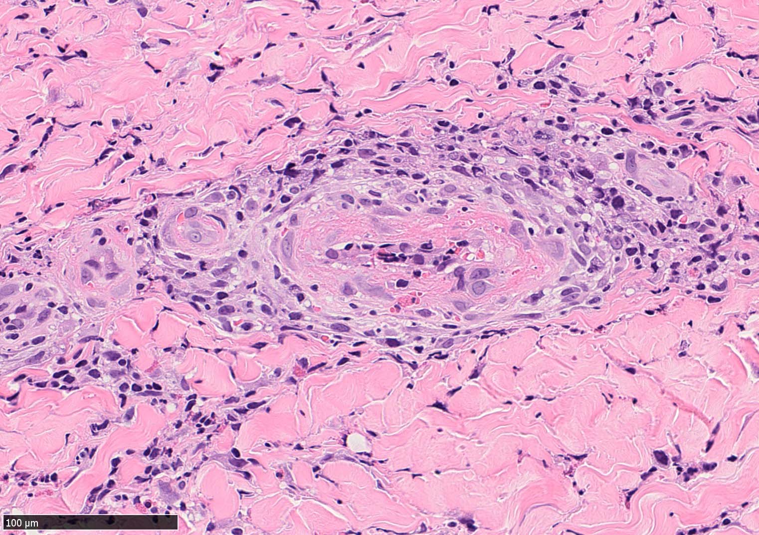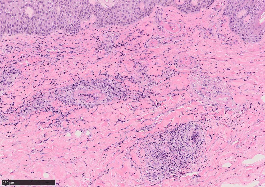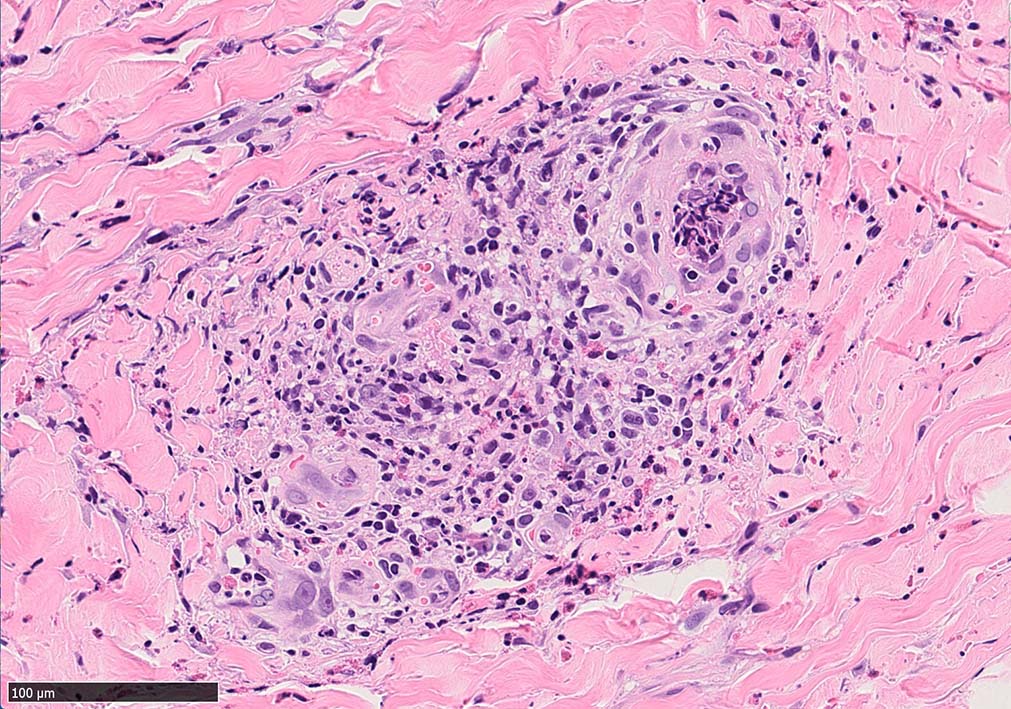 痂皮の下に硝子様凝固物があり, 周囲には壊死組織が形成されている. 近傍の細血管には凝固物による閉塞の所見があるように見える. 連続する細血管には, fibrinoid necrosisを呈する壊死性血管炎が認められる.