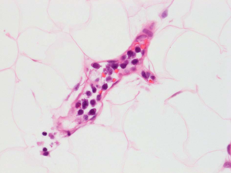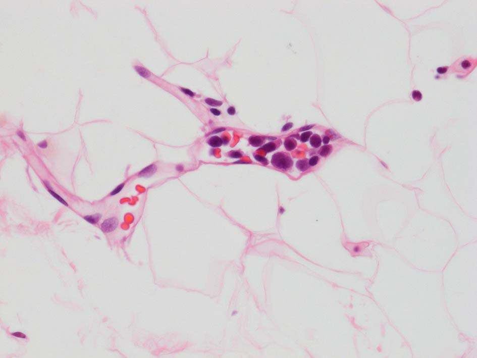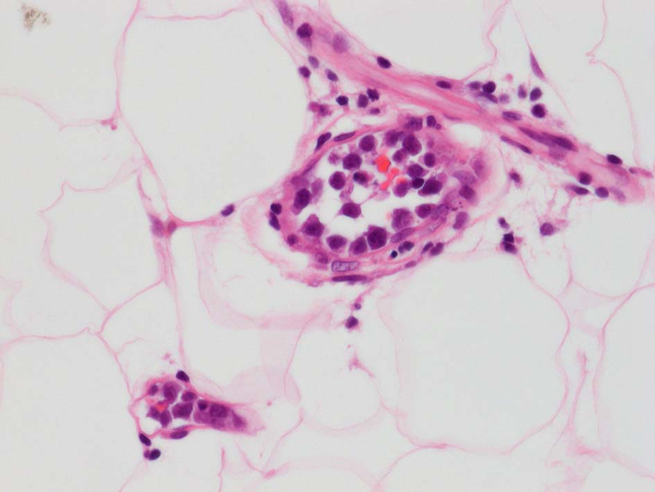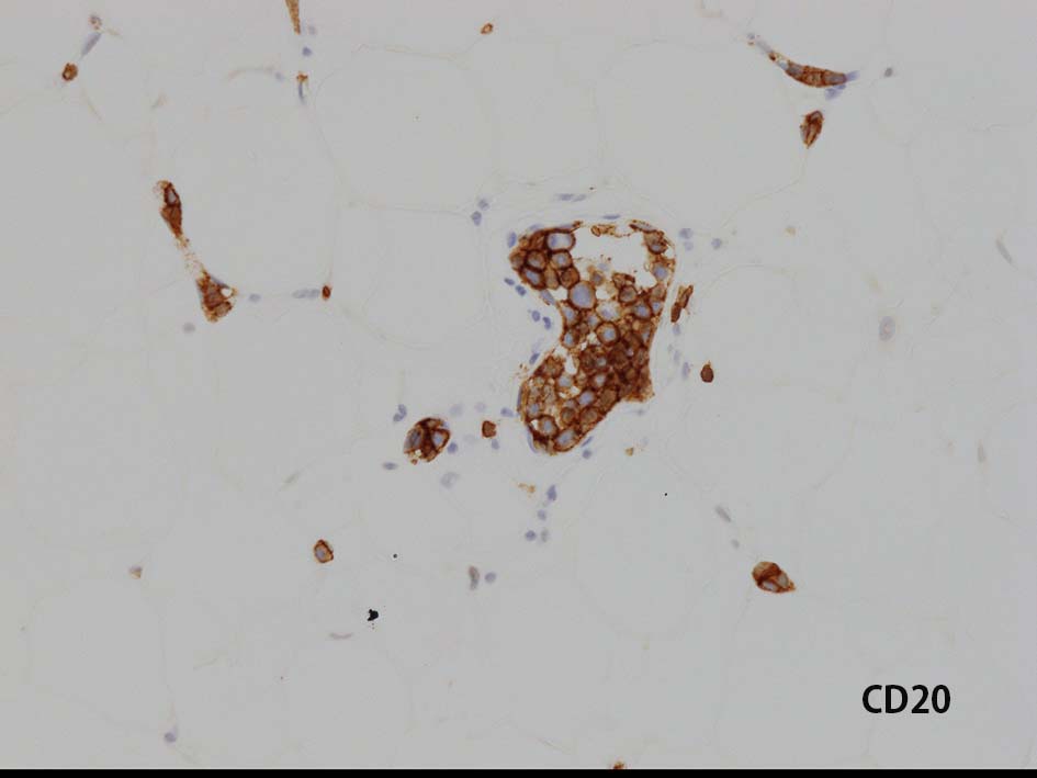 皮下脂肪織,細血管内の腫瘍細胞. 大型多型細胞より若干小さめの腫瘍細胞も認められる. CD20を先に染めておくと病変の有無がわかりやすい. HEだけで安易に「病変なし」としないほうがよい.