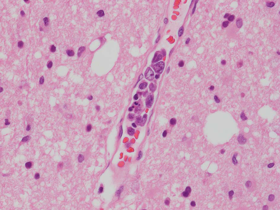 脳;くも膜下腔の小動脈内, 脳白質の細血管内に腫瘍細胞が充満している。