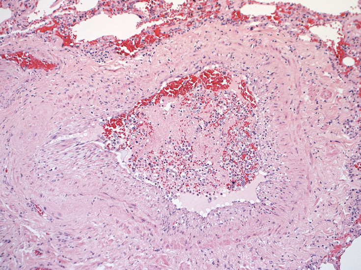 抗凝固療法をおこなう。その後MRIでは穿通枝梗塞増加. ビンスワンガー症状は動揺しながら若干悪化。ステロイド投与開始, 発語量増加, 独歩可能となる. しかし夜間せん妄出現. parkinsonism,痴呆症状が悪化した。骨髄穿刺:低形成髄。hemophagocytosisあり。異型細胞の増殖は認められなかった。追加MRI: 右放線冠などに急性梗塞が多発。抗凝固療法, ステロイドを持続, 発症より6ヶ月になり意識状態低下。CT, MRIで梗塞が急速に増加した。7ヶ月め深昏睡, 瞳孔散大, 永眠される。CTでは無数の梗塞により中心ヘルニアを呈していた。臨床上, 非定型的脳梗塞で最終的には血管内悪性リンパ腫症を疑い病理解剖をおこなった。