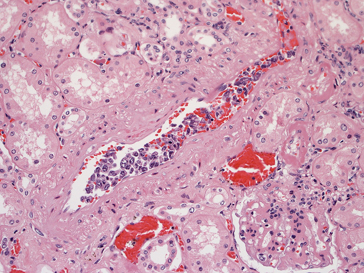 腎臓;糸球体係蹄内に腫瘍細胞が増殖するほか細腎動脈にもみとめられる。