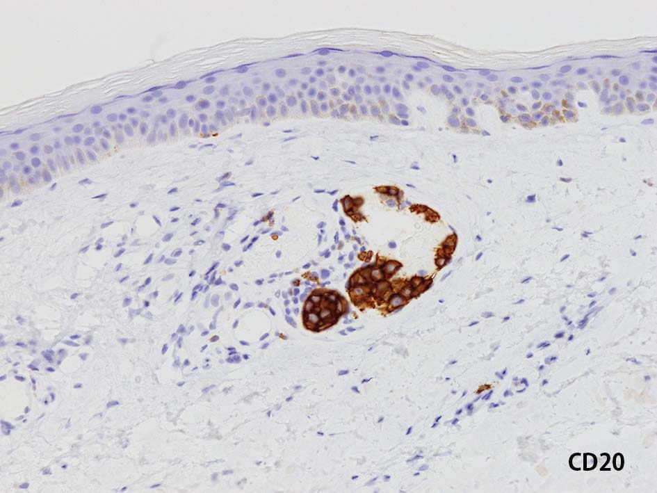 CD20陽性大型リンパ球の血管内増殖; 血管内増殖細胞はCD20陽性。