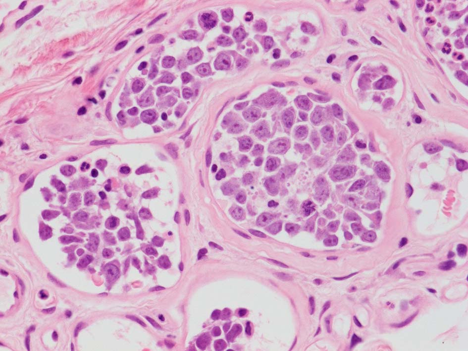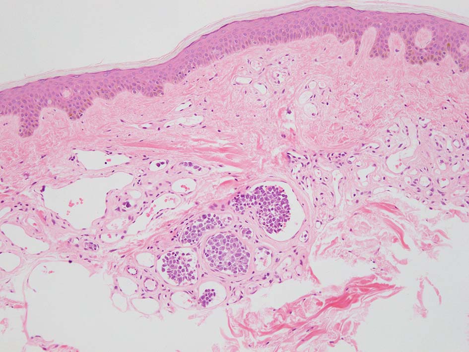 この症例は皮膚, cherry spotとよばれる老人性血管腫の血管内に腫瘍細胞集簇を認めた. (老人性血管腫はよい生検スポットといわれていたが, 必ずしもそうとはいえないらしい)
