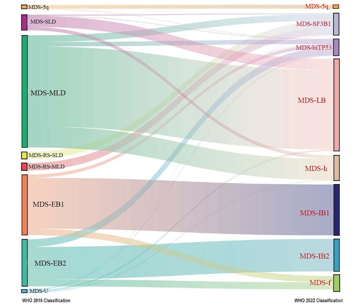 WHO2016分類とWHO2022分類で定義されたMDS患者のサブタイプ間の関係の概要。(Leukemia 2022 Dec;36(12):2875-2882¬eよりの改変引用)*1