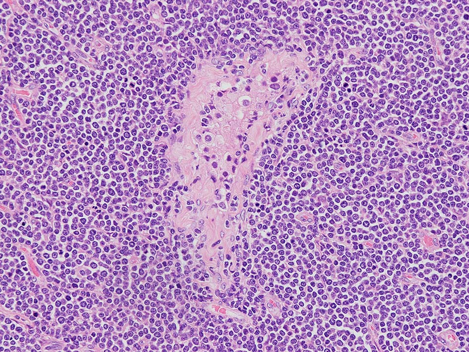 T-ALLでは, T-LBLでは、一般にリンパ節の構築物が完全に消失し、被膜に浸潤していることが確認されます。 副皮質に部分的に病変が生じ、胚中心が温存されることもあります。時に、線維性骨格の伸展により、濾胞性リンパ腫に類似した多結節性パターンが生じることがある。 T-LBLでは核小体や細胞質はあまり目立たないが、星空効果が見られ、バーキットリンパ腫を模倣することがある。 芽球の核は丸いものと畳み込まれたものがある。有糸分裂図形はしばしば多数存在する。 胸腺では、胸腺実質の広範な置換と周囲の線維脂肪組織への浸透性浸潤が見られる。