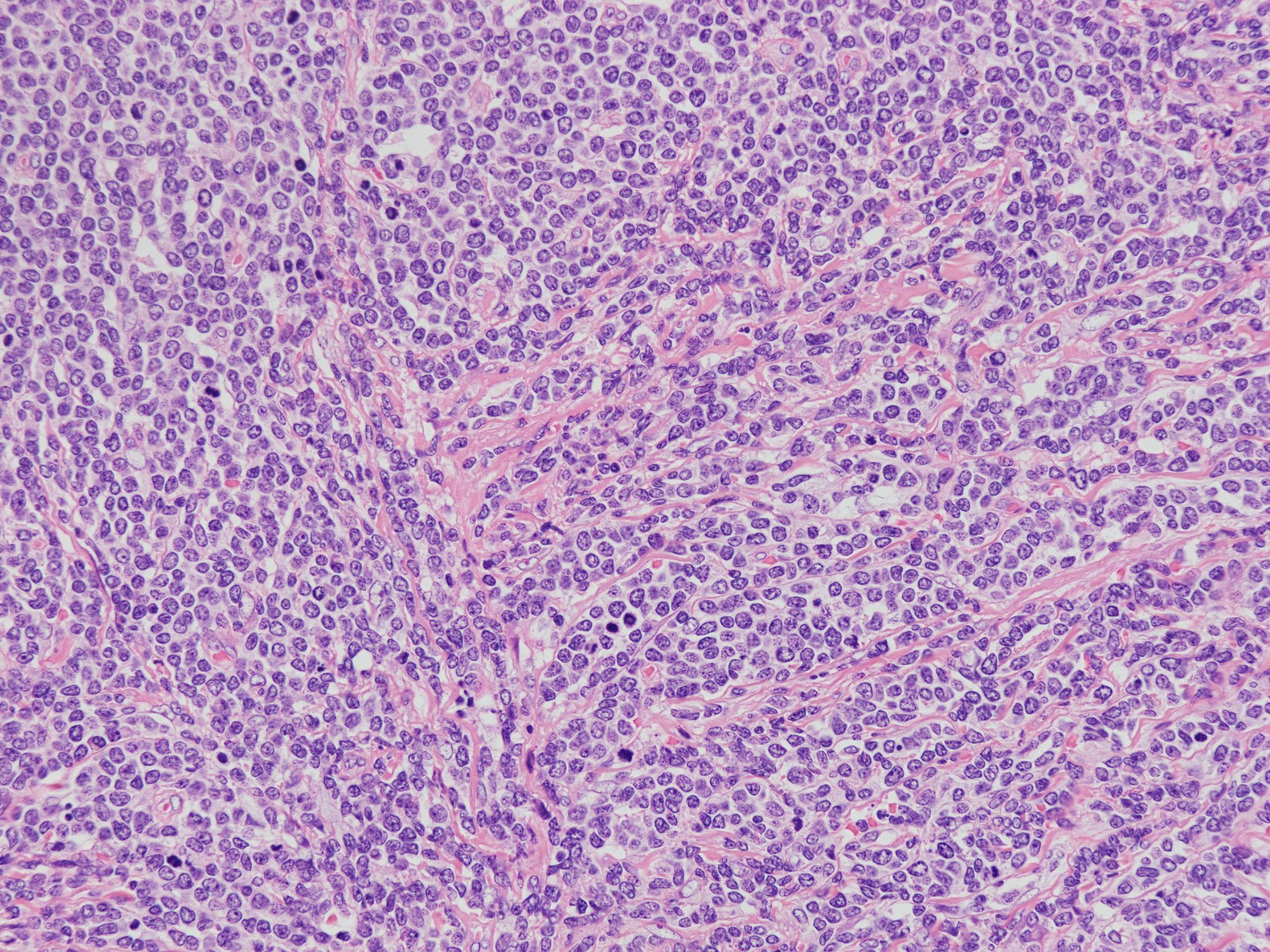 loupe像Aの領域: 精細管をスペアするように, 小型リンパ球優位, 一部中型のlymphoid cellsがシート状密に浸潤増殖する. tubulesのほとんどにはlymphoid cellsが浸潤していないが, LELに似たようなlympho-tubular lesionが少数認められた. x400高倍率では, 増殖細胞は, 粗く, 凝集したクロマチンをもつ類円形, non-cleavedな核をもつ細胞質の乏しいlymphoid cellsである. 核小体か凝集したクロマチンかわかりにくい.