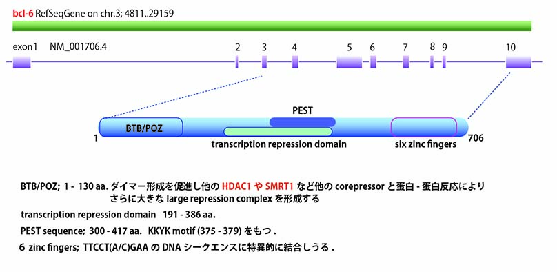 bcl6; ヒト胚中心由来びまん性大細胞リンパ腫(DLBCL)の染色体転座部位(3q27)から単離された癌遺伝子*1*2