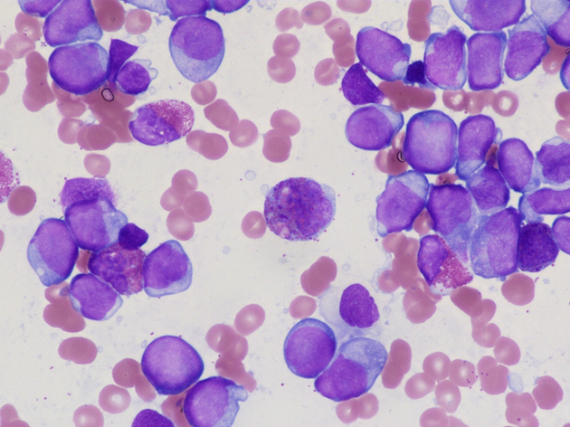 中央と右にbasophilicな大型顆粒をもつ異常好酸球が認められる。この症例では異常好酸球が少なかった。(クリックで大きな画像がみられます)