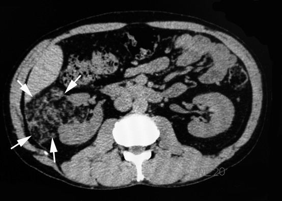 右腰痛のため受診。精査で右腎に出血をともなう直径7cmの腫瘤を認めた。angiomyolipomaの出血と診断し, 出血の消失をまって右腎摘出術をおこなう。