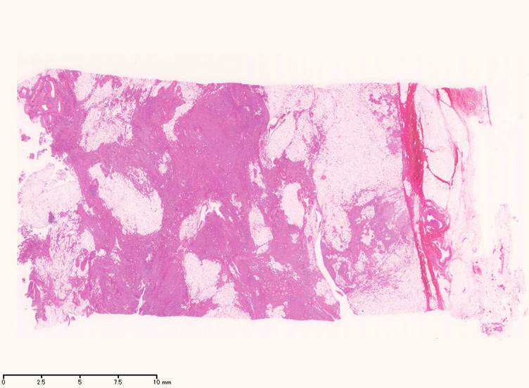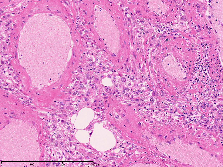 組織では血管, 平滑筋, 脂肪組織より構成され, 無秩序に混在する。