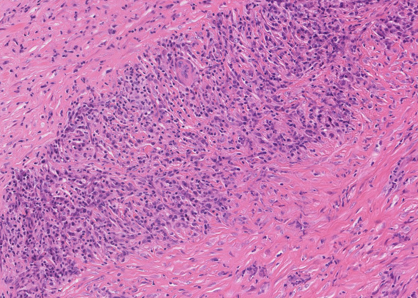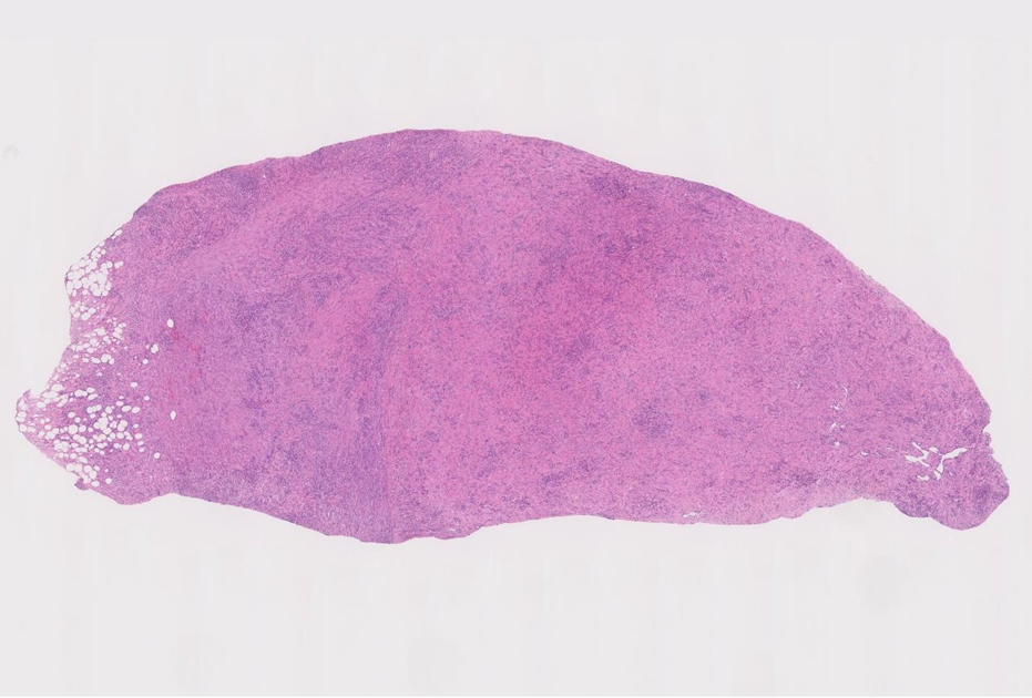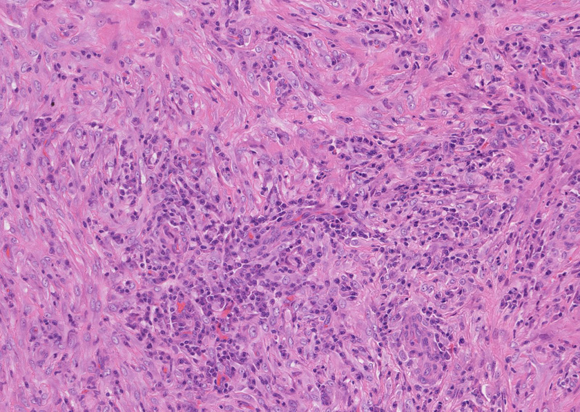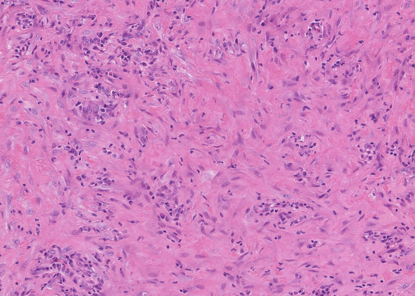 線維化組織に類円, 葉巻型淡明な核の紡錘型細胞が増生している。免染SMA陽性。血管周囲に慢性炎症あり。