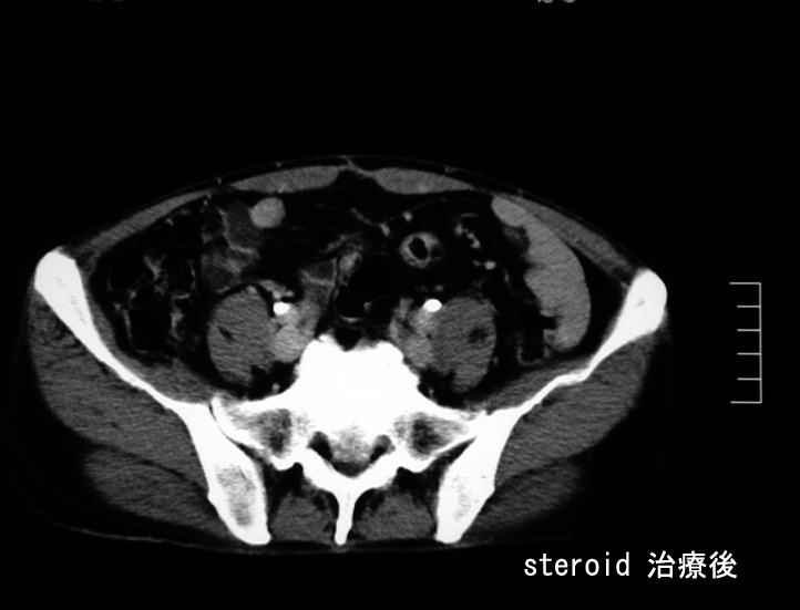 Steroid 治療2ヶ月後のCT; 腫瘤性病変の著明な縮小と消失が確認できる。