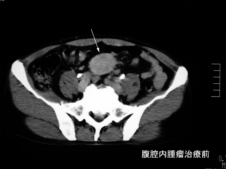 腹腔内には静脈を巻き込むように血管周囲に腫瘤の形成がある。(クリックで大きな画像が見られます)