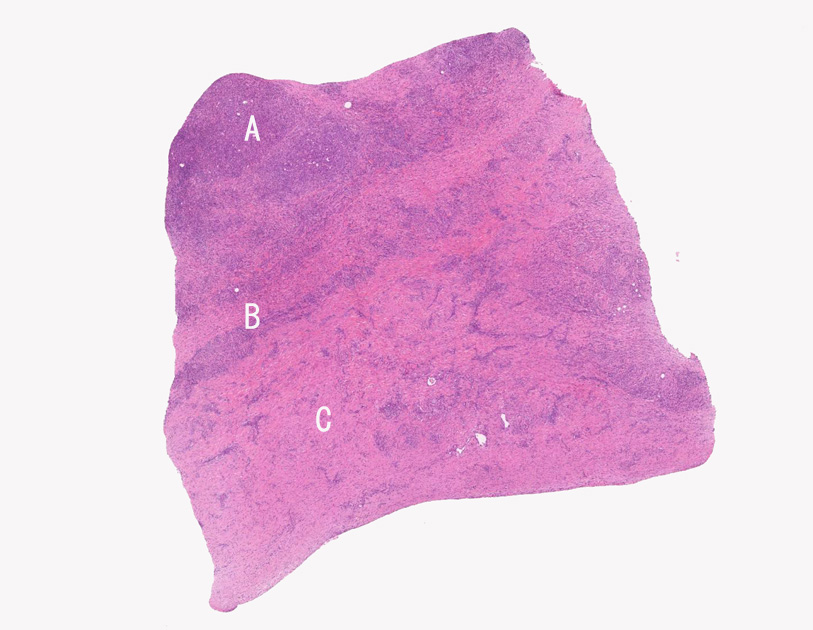 Bの部位では血管中心に形質細胞の密な浸潤像が所見として見られる