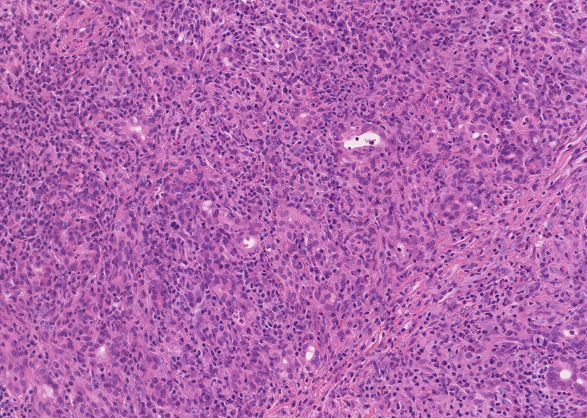 組織像は膵腫瘤B, Cと同じくinflammatory myofibroblastic tumorである。島状に形質細胞主体の慢性炎症が強い。腹膜腫瘤には腺管は認められない。