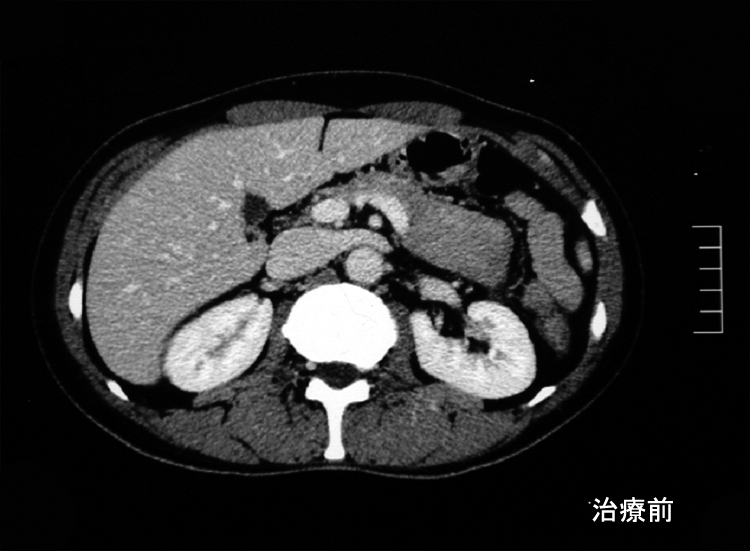 悪性リンパ腫や膵癌など悪性腫瘍は否定され自己免疫性膵炎と診断し, steroid治療を開始する。約2ヶ月の投与で, 膵、腹腔腫瘤は著明に縮小または消失しました。steroid減量中に黄疸が出現, 画像診断で硬化性胆管炎の合併をうたがいsteroidを増量、黄疸は消失。以後steroid をゆるやかに漸減し中止したが症状の再発はない。