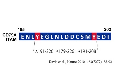 - ABC type DLBCLのcell line, OCI-Ly10ではCD79A ITAMのsplice donar siteに変異がある。18個のアミノ酸が欠損し2番目のチロシンを含むITAMはほとんど欠失している。*4