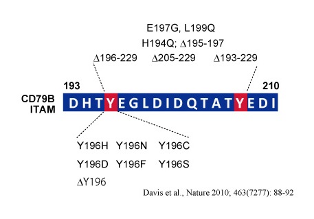 - ITAM domainの最初のチロシン(Y)のmissence mutationは16例中14例であり, Davisらの報告の結果が保たれている。