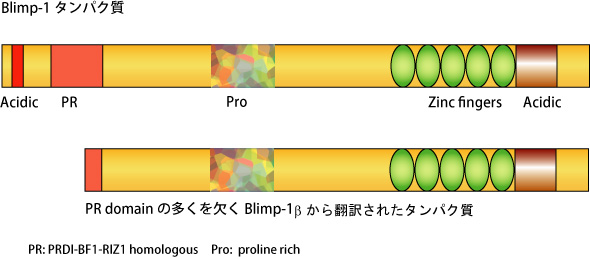 - Blimp-1βはBlimp-1αのexon3とexon4の間に存在するpromoterより転写され,Blimp-1αにあるexon1-3が欠失しており, 新たに5'末端側にexon1βをもつ。このため翻訳後のタンパク質ではPRドメインの大部分が欠失している。