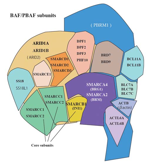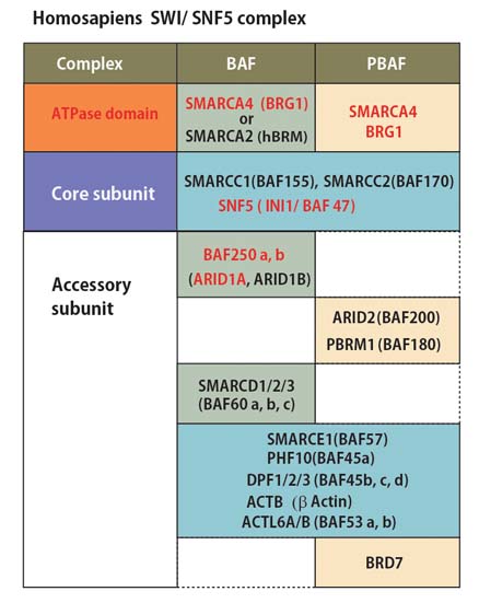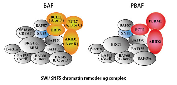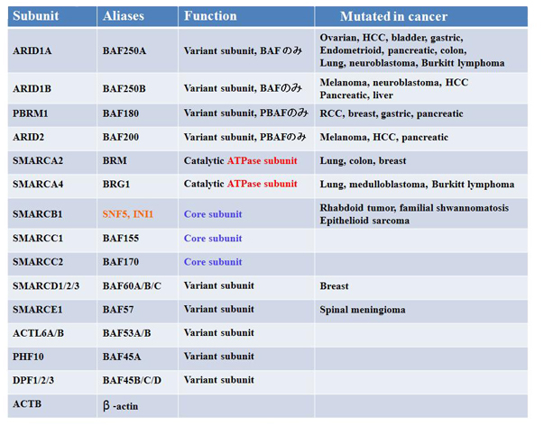 これまでにヒト悪性腫瘍で, SNF5 (SMARCB1, INI1, BAF47), ARID1A (BAF250A, SMARCF1), PBRM1 ( BAF180 ), BRG1 (SMARCA4)などの変異が報告されている。