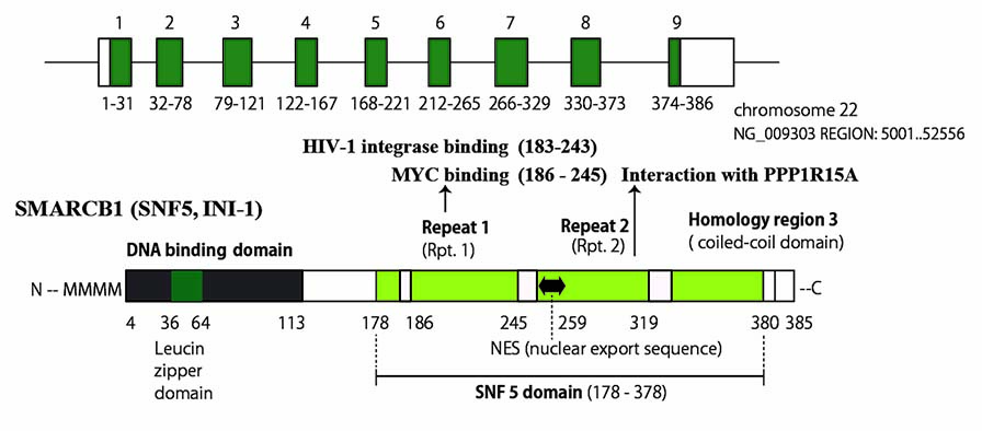 SNF5は385個のアミノ酸残基から構成され,Saccharomyes cervisiaeにおけるSFH1,DrosophilaにおけるSNR1,C elegans,Saccharomyes cervisiaeやyeastのSNF5において保存された3つの領域が確認されている.そのうちの2つは不完全ではあるが繰り返しのアミノ酸配列が見られる(repeat1:186~245位のアミノ酸,repeat2:259~319位のアミノ酸)