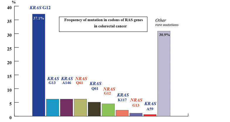 K-Ras遺伝子exon3, exon4変異, N-Ras遺伝子 exon2, exon3, exon4変異の頻度は欧米の臨床試験で10-15%(K-Ras exon2変異の約20%). N-Ras exon4(codon117, codon146)変異は全大腸癌の0.3%未満と極めてまれ.