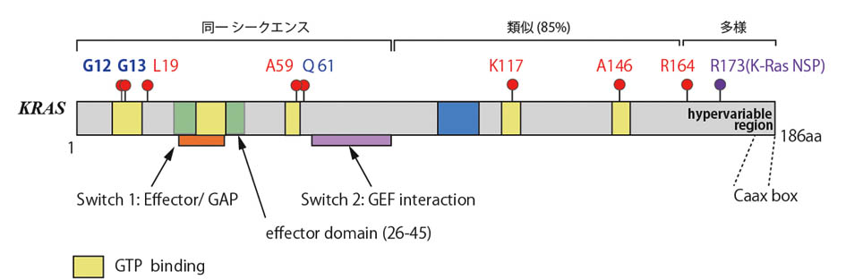 RAS遺伝子変異によりアミノ酸置換が生じ, 変異型RASはGTPへの結合はできるが, GTPの加水分解ができなくなり恒常的に活性化状態となり, 下流に過剰シグナルを送りつづける.