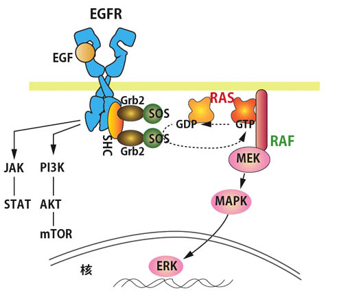 - EGFRは, 細胞外から上皮成長因子(EGF), amphiregulin, epiregulinなどのリガンドが結合し, EGFRもしくは, 他のHERファミリー分子との二量体を形成, 細胞内チロシンキナーゼドメインの自己リン酸化を介して活性化され, 下流へのシグナル伝達が起こる.