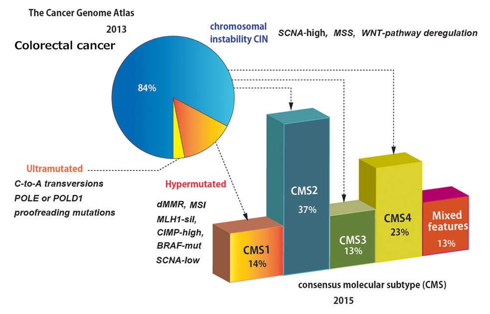 コンソーシアムCRCSCにより, 各グループの大規模データ統合解析を行い遺伝子発現解析から大腸癌の87%について、CMS1から4までのsubgroupに分類した.