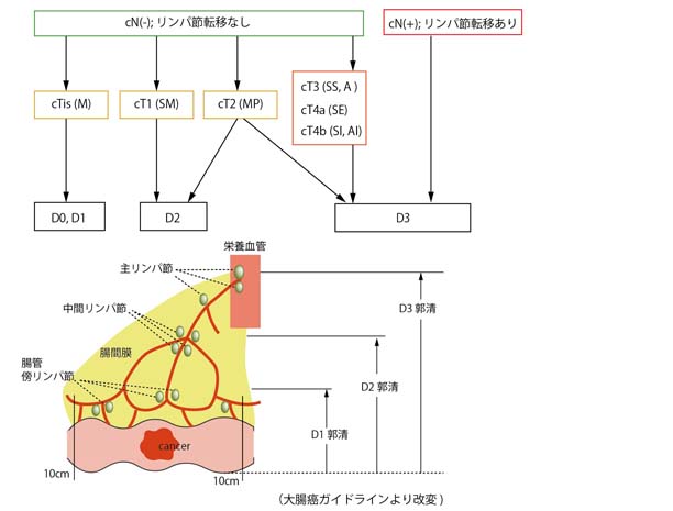 - 直腸癌では口側は, 最下S状結腸動脈流入点, 肛門側は腫瘍辺縁からの距離で腸管傍リンパ節範囲を決める.