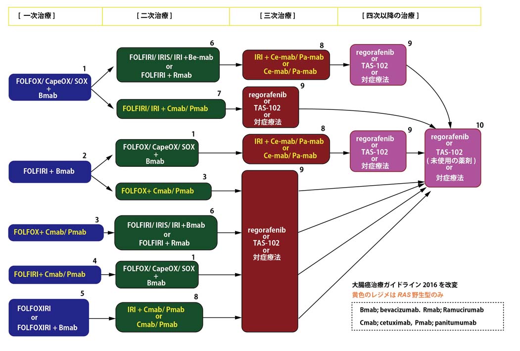 これまでの標準治療で不応, 不耐になった症例では, マルチキナーゼ阻害薬のregorafenib, 新規経口ヌクレオシド径抗がん薬のTAS-102(トリフルリジンとチピラシル塩酸塩という2成分を合わせた抗がん剤)が選択される.