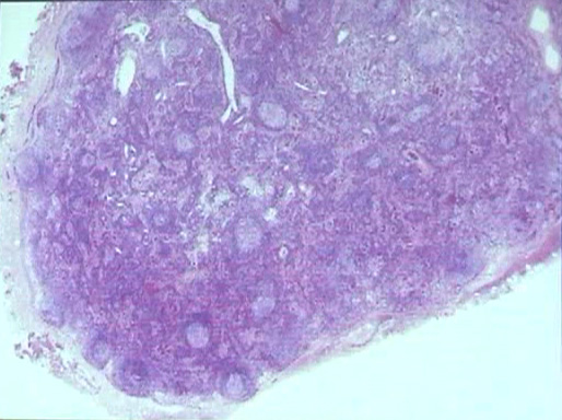 萎縮したリンパ濾胞が散在, 胚中心はリンパ球に乏しくFDC陽性の紡錘形細胞がトグロを巻いているように存在し周囲の血管進入像もある。濾胞間には血管が増生, リンパ球は減少している。