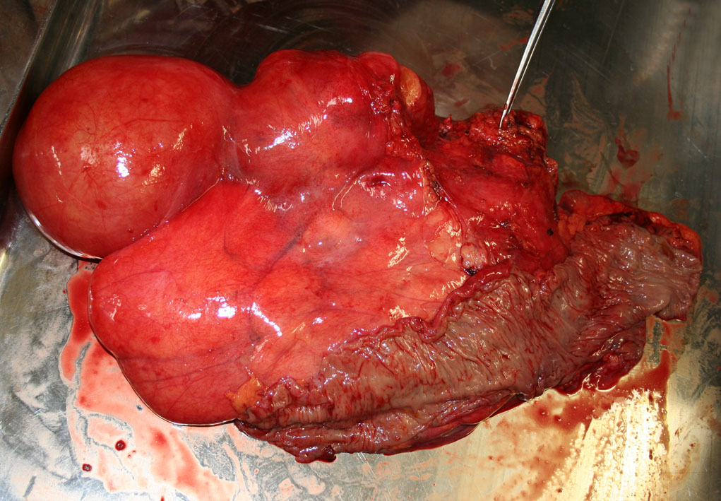 固定前の肉眼所見。後腹膜に3個の大きな結節状腫瘤が認められる。左図ピンセットでつまんだ近傍に右腎が存在する。右割面。