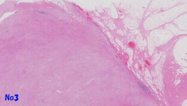 さらに腎臓に隣接した部分には硬化した線維性間質を伴い, 軽度異型を示す紡錐形細胞が束状または車軸状に増殖する脂肪由来には見えない結節構造がある。liposarcomaの脱分化成分と考えられる。(Virtual Slide-No.6)