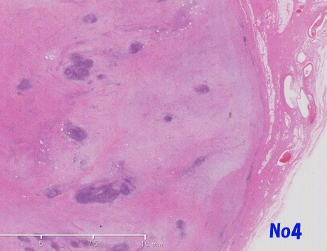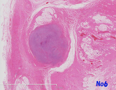 他の部分では異型細胞は, リンパ濾胞がよく発達した豊かな膠原線維性またはfibromyxoidな間質を伴って増殖しておりsclerosing and/or inflammaory variants of well differentiated liposarcomaの所見を呈する(Virtual Slide-No.3 and No.4) 。metaplastic ossificationが一部に認められた(Virtual Slide-No.5) 。